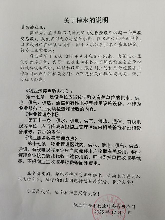 針對盛世榮華小區此次欠費停水事宜,12月2日,雲豐物業向業主說明稱:因部分業主長期不及時交費(欠費金額已遠超一年應收費總額),致使雲豐物業無力再墊付水費,供水單位已停止供水,目前雲豐物業還在繼續協調中,因小區水箱備用水已基本供完,將停止正常供水。