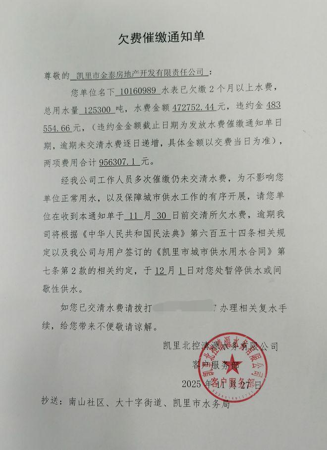 據凱裏北控清源客戶服務部11月27日出具的《欠費催繳通知單》(下稱通知)內容顯示,凱裏市金泰房地產開發有限責任公司名下的盛世榮華小區水表截止11月30日,共欠兩個月的水費。用水量為125300噸,合計金額472752.44,其中違約金483554.66元,所欠水費加上違約金總合計為956307.1元。違約金已遠超實際所欠水費的總金額。